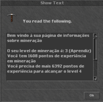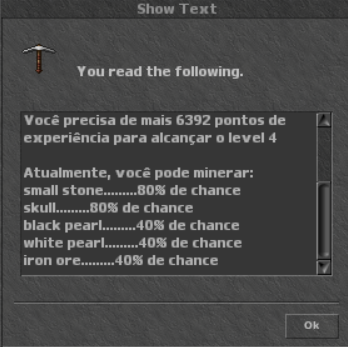 Como funciona? --> Existe uma área de mineração no servidor que pode ser acessada pela sala de Games (TP NO TEMPLO) . Dentro dela é possível usar uma pick para minerar nas paredes de terra. Conforme você vai minerando, vai podendo subir em level de mineração e, a cada level, os itens que você consegue minerar melhoram. Você pode vender todos os itens que você minera para o NPC Minerador Aprendiz que fica localizado na área. Este é um bom método para juntar dinheiro no servidor (aconselhamos minerar de bot). Use o comando !mining para ver suas informações. Confira aqui o Ranking de mineração.